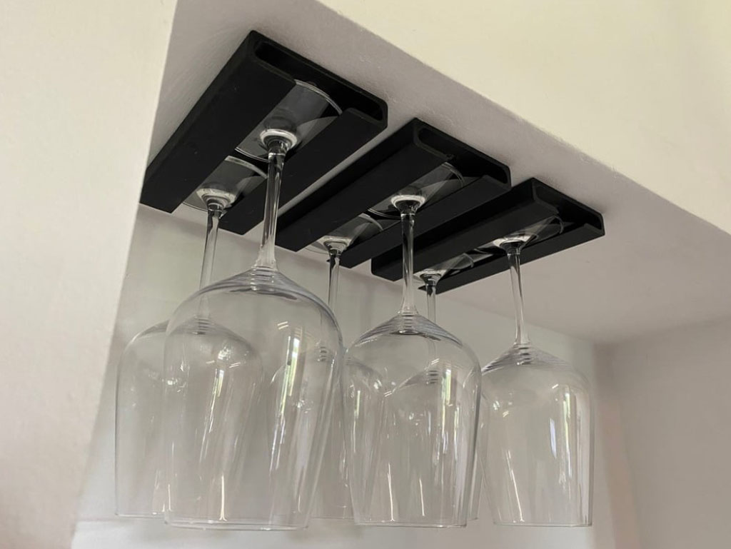 Soporte para copas de vino debajo de gabinete, permite colocar hasta 2 copas de 20 cm, precio aplica por unidad.