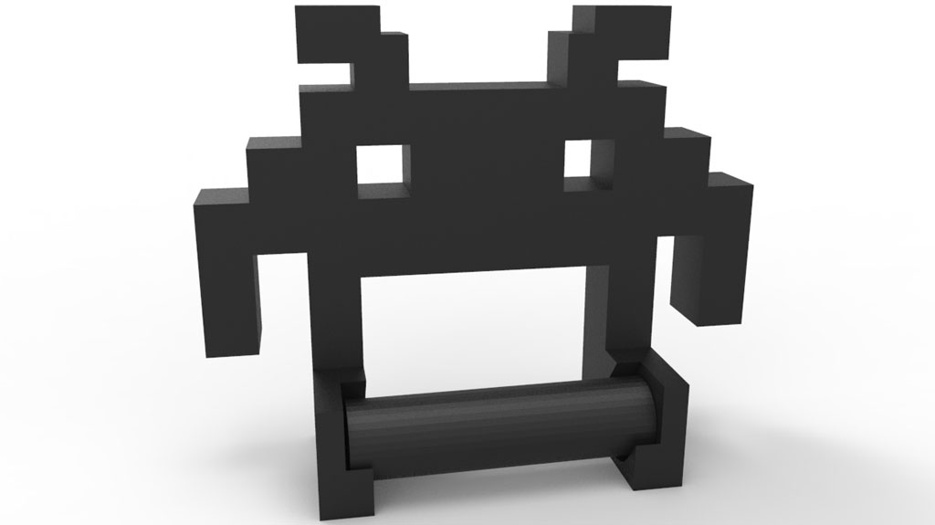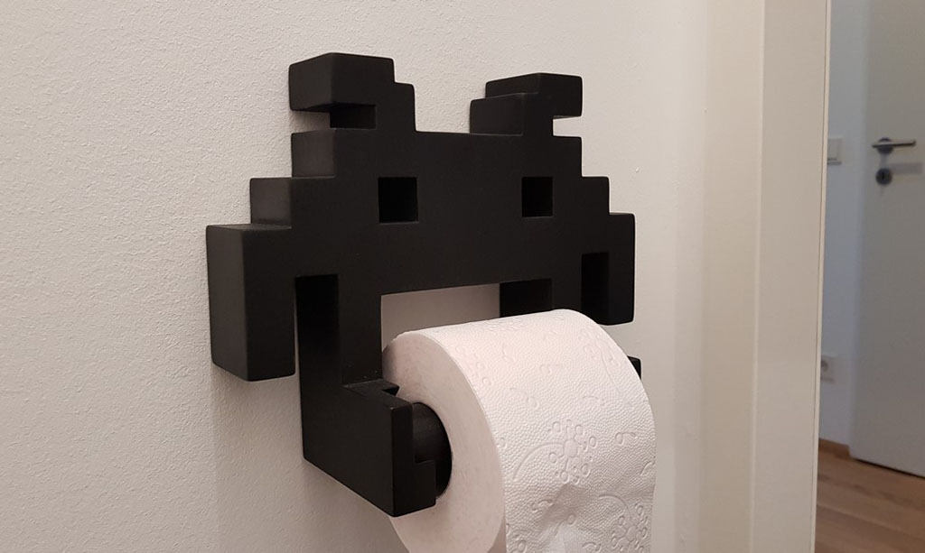 Soporte de muro divertido para papel higiénico o confort alusivo a space invaders.