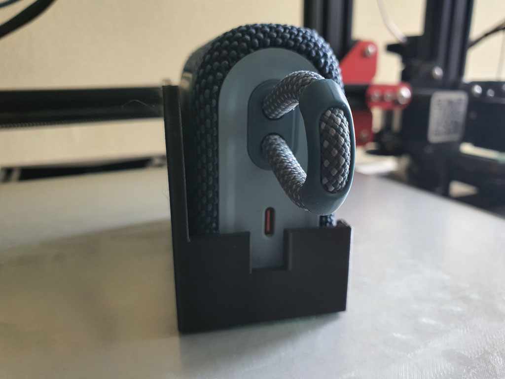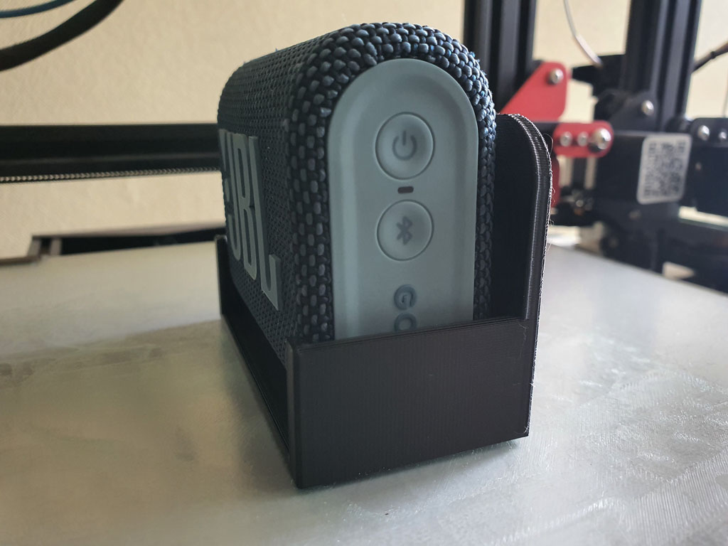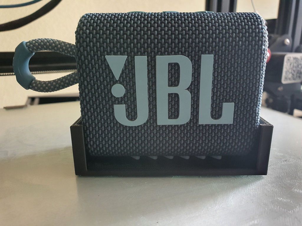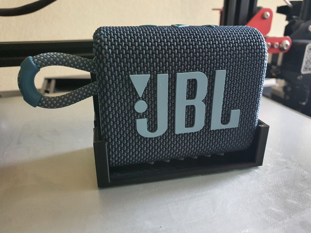 Soporte de muro compatible con parlante JBL Go 3, permite conectar el cable cargador del lado derecho. Fabricado en impresión 3D material PLA. Dudas o consultas en la sección más abajo. (No incluye parlante)