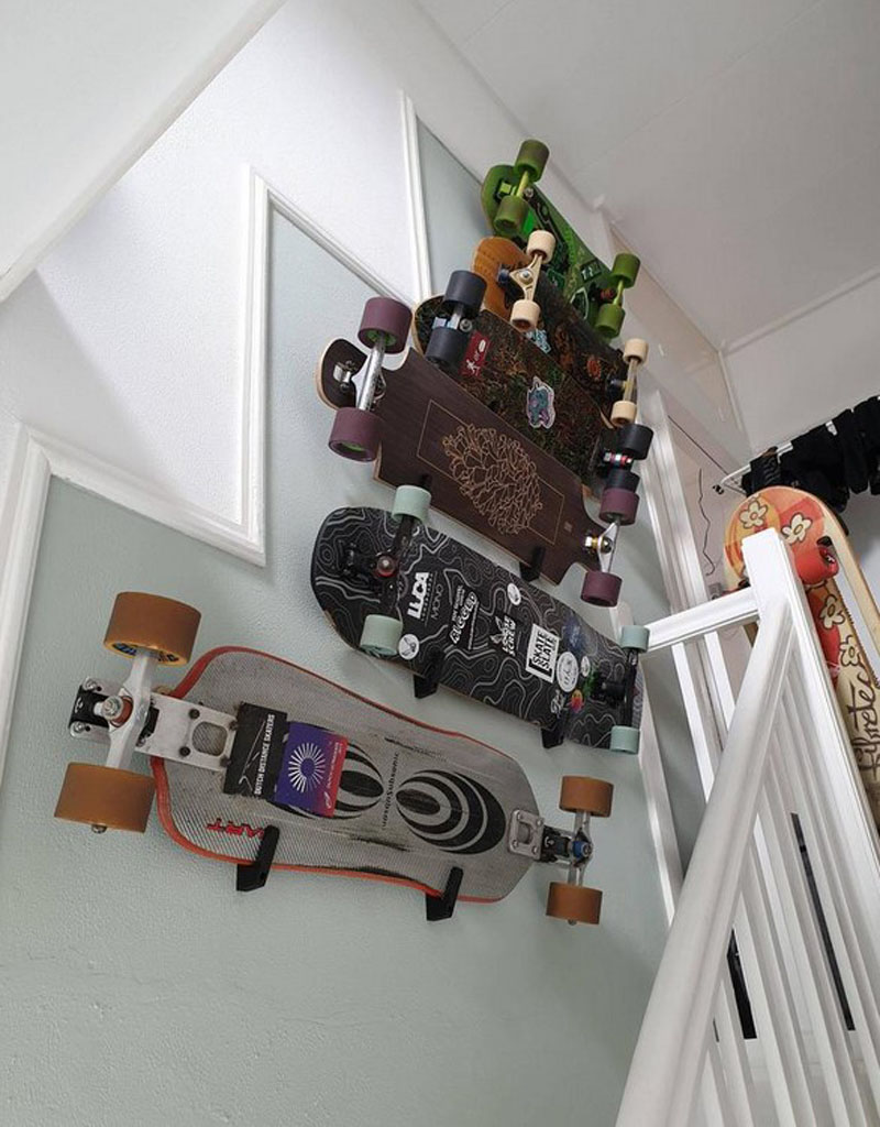 Soporte de muro para longboards, skate y penny boards instalación horizontal tal y como se muestra en la foto.