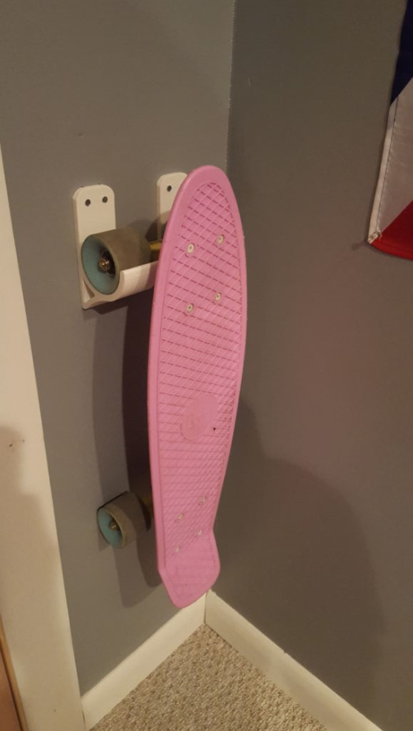 Soporte de muro para patinetas skate instalación vertical tal y como se muestra en la foto, compatible con ruedas de hasta 60 mm. Dudas o consultas en la sección más abajo.