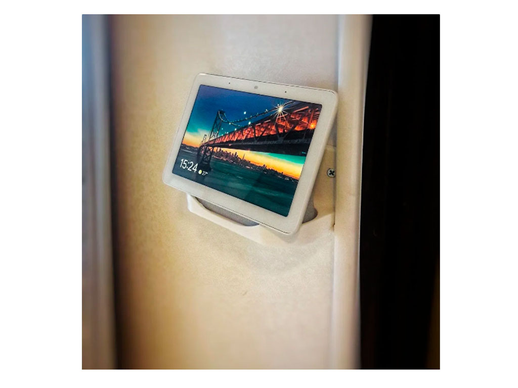 Soporte de pared o muro para google home hub, permite colocar el cable interno y guiarlo por la parte de atrás hacia abajo.