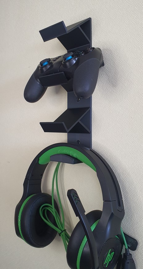 Soporte triple control PS5, PS4, Xbox y audífono muro impreso 3D (No incluye controles).